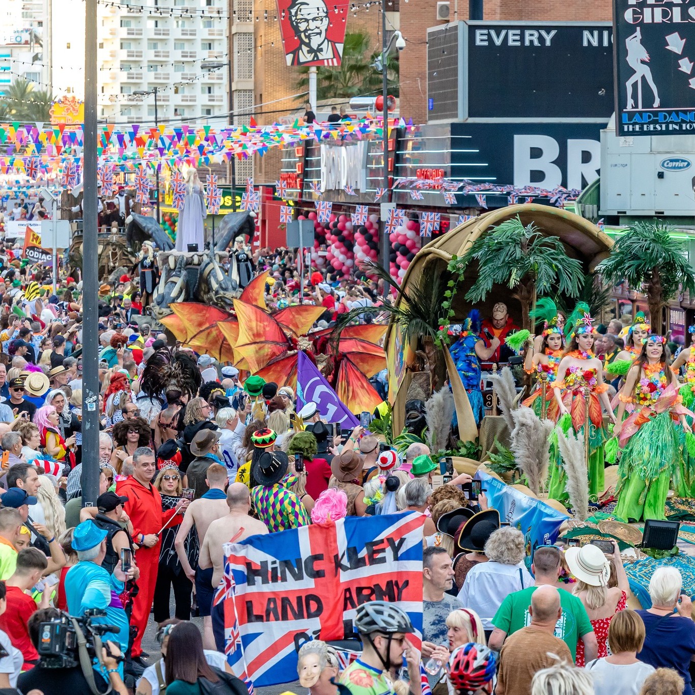 The highlight of the day is the spectacular parade that kicks off around 2-4 PM. Featuring elaborate themed floats, live music, dance groups, and DJs, the procession winds through the heart of the "British Square" area: